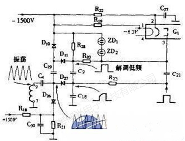 ¡¡¡¡´ÓÂö³å±äѹÆ÷µÄ´Î¼«£¨9½Å£©Êä³öµÄ¸ßƵ½»Á÷µçѹͨ¹ýC4ñîºÏµ½½âµ÷Ôö»Ôµç·¡£¸ÃµçѹµÄÉÏÏÞÖµ±»D26ǯλÔÚR18ºÍR21µÄ·Öѹֵ120V£¬ÏÂÏÞÖµ±»D27ǯλµ½Ôö»Ô·Å´óÆ÷Êä³öµÄÖ±Á÷µçƽ£¬¸ÃÖ±Á÷µçƽÓÉÁÁ¶ÈµçλÆ÷¸Ä±äµÍѹͨ¹ýÔö»Ô·Å´óÆ÷À´¿ØÖÆ¡£Ôö»ÔÐÅºÅµÄµÍÆµ·ÖÁ¿¶Ô¸ßƵ½»Á÷Ðźŵ÷ÖÆ¡£µ÷ÖÆÐźŵÄÕý°ëÖÜͨ¹ýD10¡¢-1500V¸º¸ßѹԴ¶ÔC29³äµç£¬ÓÉÓÚD10¸º¼«Óë-1500VÏàÁ¬£¬ÕâʱC29Á½¶ËµÄµçѹΪ1620V¡£µ÷ÖÆÐźŵĸº°ëÖÜʹD10½ØÖ¹£¬D27µ¼Í¨¡£D27Õý¼«µçλ±»Ç¯ÖÆÔÚÔö»Ô·Å´óÆ÷µÄÖ±Á÷Êä³öµçƽÉÏ£¬C29Éϵĵçѹͨ¹ýD11¡¢C9ºÍD27·Åµç¡£¾¹ýÈô¸É³ä¡¢·ÅµçÖÜÆÚºó¡¢C9ÉϵĵçѹµÈÓÚC29ÉϵĵçѹΪ1620V¡£¼ÓÔÚD27Õý¼«µÄǯλµçƽÊÇÔö»Ô·Å´óÆ÷µÄÊä³öÖ±Á÷µçѹ£¬ËüÓÉÔö»ÔµçλÆ÷¾ö¶¨£¬¼ÙÈçΪ9OV£¬ÓÚÊÇD11Õý¼«µÄµçλ¼´Îª-1530V£¬Ïà¶ÔÓÚÒõ¼«²úÉúÁË30VµÄ¸ºÆ«Ñ¹¡£´ËÕ¤¼«¸º¸ßѹºÍ¾µçÈÝÆ÷C21À¡ËÍÀ´µÄÔö»ÔÂö³å¸ßƵ·ÖÁ¿Ïà¼ÓºÏ³Éºó¼ÓÖÁʾ²¨¹ÜÕ¤¼«£¬ÊµÏÖÁÁ¶È¿ØÖÆ¡£·ÖÎö¿É¼û£¬Í¨¹ýµ÷ÕûÁÁ¶ÈµçλÆ÷£¬Ê¹µÍѹÊä³ö±ä»¯£¬È¥¸Ä±ä¸ßƵ½»Á÷µçѹÔÚ½âµ÷Ôö»Ôµç·ÖеÄǯλµçƽ£¬ÇÒͨ¹ýÔö»Ô·Å´óÆ÷¸Ä±ä¸ßƵÐźŵĵ÷ÖÆ¶È£¬´Ó¶øÒýÆðÕ¤¼«¸º¸ßѹµÄ±ä»¯£¬×îÖÕʵÏÖÁÁ¶È¿ØÖÆ¡£¾Û½¹½âµ÷Ôö»Ôµç·µÄ¹¤×÷¹ý³ÌÓëÁÁ¶È½âµ÷Ôö»Ôµç·µÄ¹¤×÷¹ý³ÌÍêȫһÑù£¬²»ÔÙ׸Êö¡£